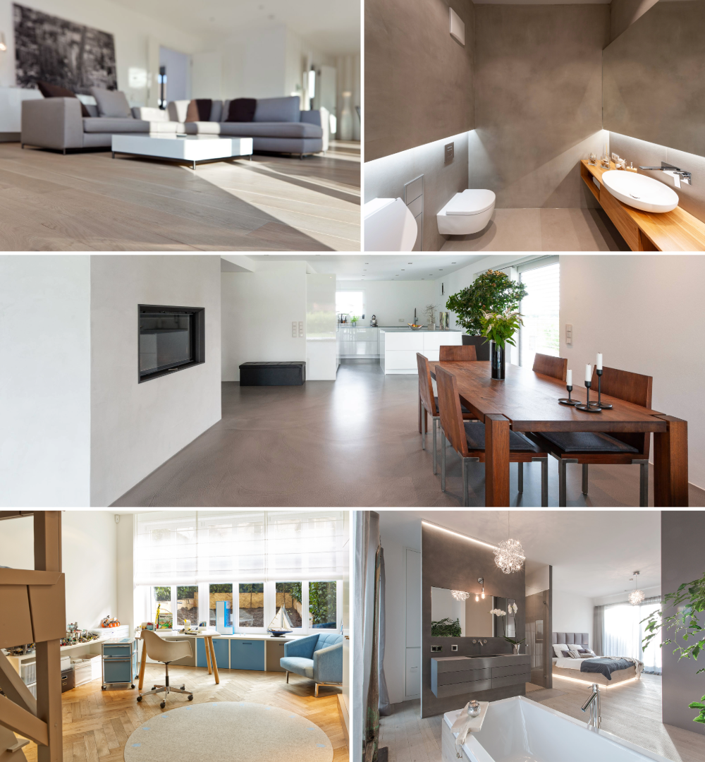 • Materialien: Typische Varianten sind Spachtelboden, Mikrozement oder Sichtestrich.
